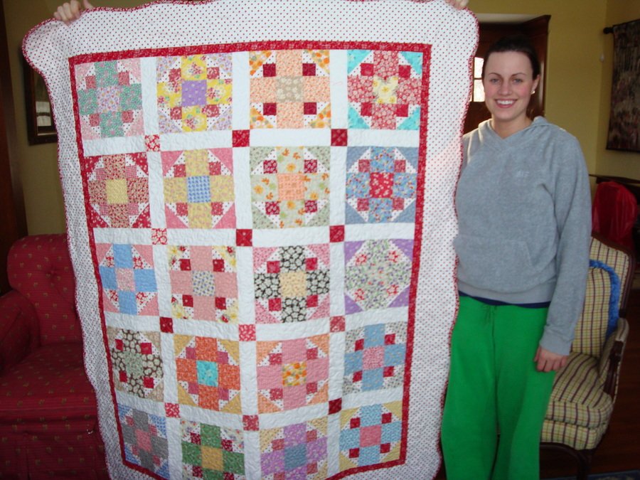stephiepeterson Wash Day - This was a really fun quilt to make. We made it at a retreat called Winterfest (well, I finished at home after the retreat). It was a mystery quilt...my first! And it was a real mystery, because they provided the fabric for us. I loved the vintage flavor of the fabrics. This was my first curved binding/edge. It was fun to do. My niece loves red, and she is the godmother to my daughter, so I gave it to her for Christmas this year. I think she was really surprised. She is pictured with the quilt.