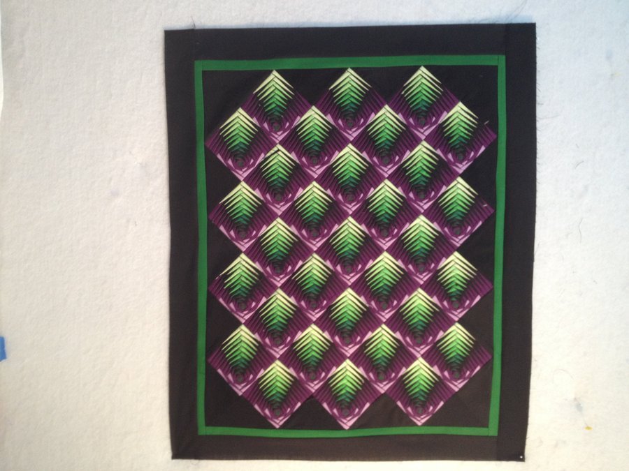 Enice Tree Dimensional - The first mini by George Siciliano wasn't too bad so I tried another. 70 pieces in a 3" block. 31 blocks total. Most of them were made by machine, 3 I make by hand while I was on vacation. There was no wine while making this little monster. Really I was so pleased every time one of those little blocks came out correctly. Well worth the effort. I did use George's fabric.