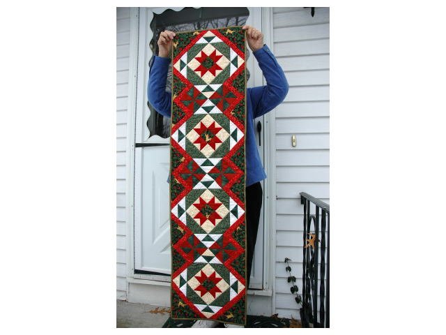singquilt Nancy's Christmas Runner - Christmas table runner made for my niece from California who is presently living in Bahrain. Doesn't show on picture, but triangles in center of stars and half of pinwheel made from metallic red and green striped fabric. Made with fat quarters.