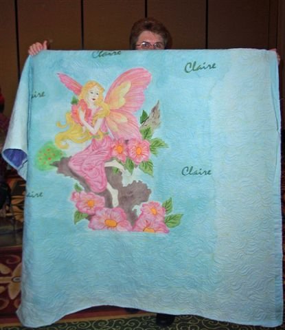 pbrush Fairy Dust - This quilt was hand painted from the front page of 'Fairies' by Darcy May. I took the picture over to the copier and blew it up and then used that as the pattern to paint from. It was for one of the grand kids and she just looooves it.