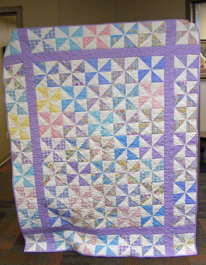 | Design Source - Description | Idea was from a quilt in Fons and Porter magazine, Made a little different in size. Renee quilted this so beautiful. It has a design over each pinwheel and swirls over the stipes of lavender. it is twin size |