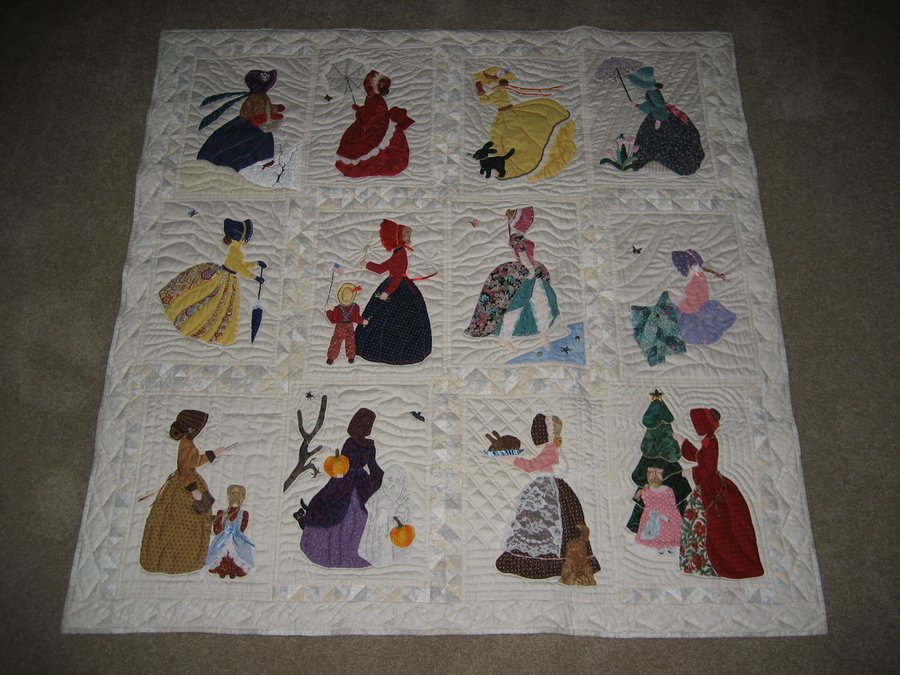 dahlialady Bonnet Girls Through the Year - It was fun choosing different bonnet girls to applique, appliqueing them and then doing embellishments. I used Hobbs Wool Batt. It is wonderful to hand quilt.