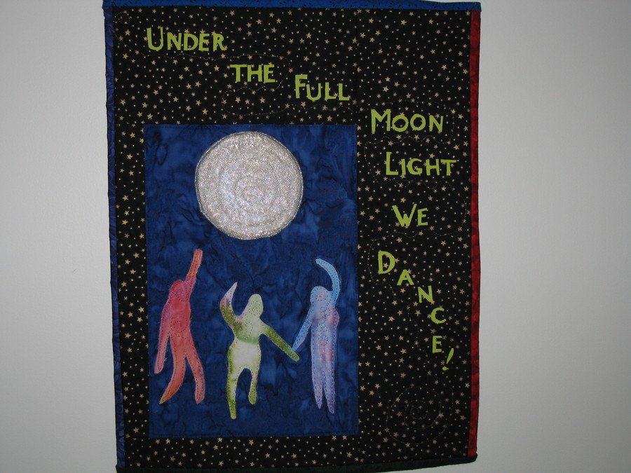 cosette5014 Under the Full Moon Light - This small quilt was inspired by the dancing women that "appeared" in the hand dyed-hand painted fabric. It sold at my churches member art show. My favorite part is the moon which was made with several layers of fancy polyester fabrics.
