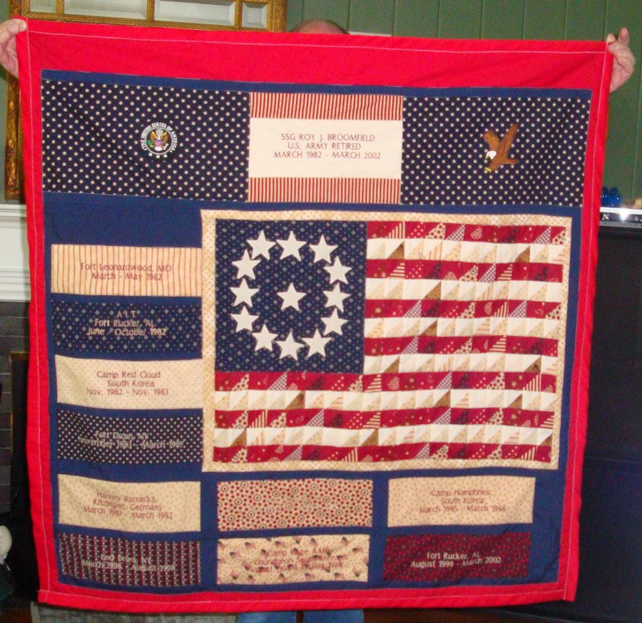 GrammaBarbara Celebrating Service - I wanted to make a quilt for my son-in-law to commerate his 20 year retirement from the United States Army. I saw a few similar country flag squares and patterns and decided to use a patchwork flag as the center of the theme. I wanted to note all the Army bases he was posted to and the overall design grew from there.