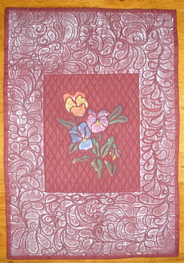 mslibra Trapunto Pansies - I joined our Guilds sub-group call Fibre Speak and was inspired to try mixing acrylic paint and fabric. I did trapunto work for the pansies with a 1/2" grid behind them and what I call "fantasy feathers" in the border. After blocking of the grid-work and pansies I rolled white acrylic paint onto the feathers. The pansies are painted with water soluble pencil crayons. Lots of fun to do!