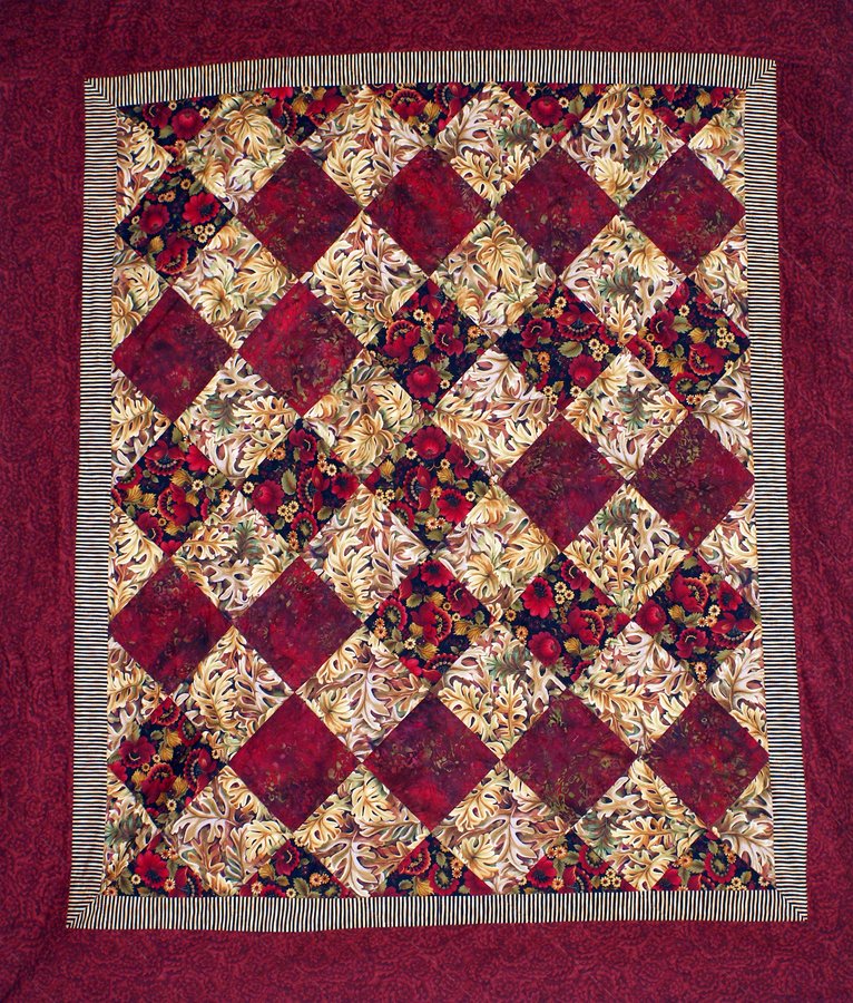Ibquiltn2 Christmas quilt for Mom - Design sewn in checkerboard fashion, cut diagonally and rearranged to form diamond grid. I played with the placement of the 2 dark fabrics.