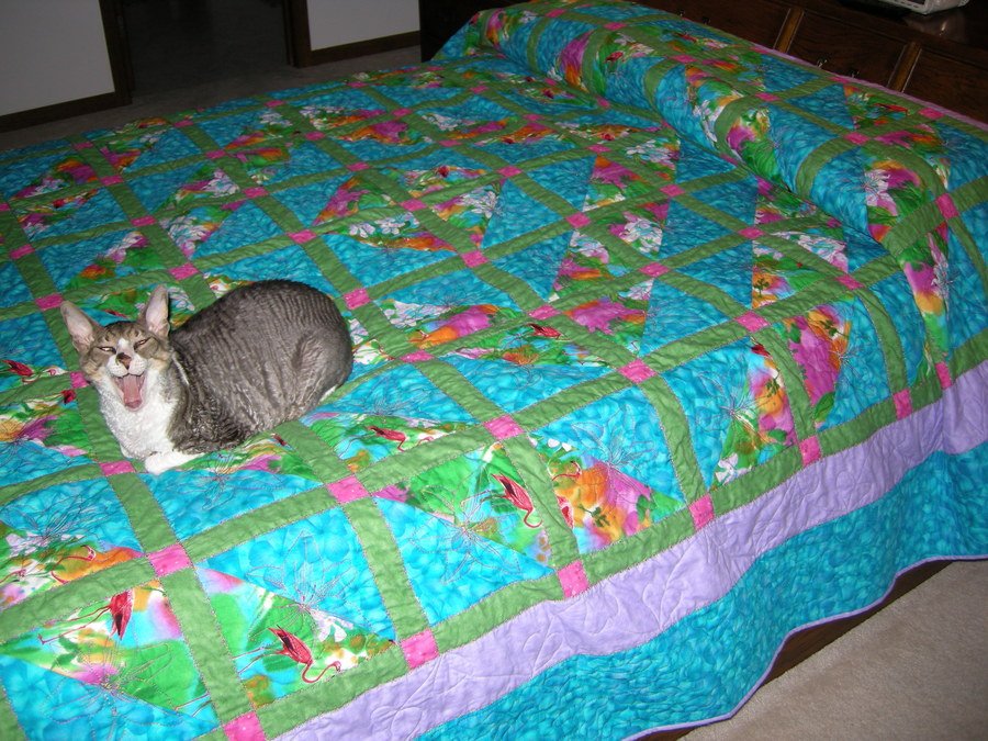 Melynda Tropical Garden Window - This is the first quilt I have made for myself. I had some bright tropical print fabric I decided not to use in my Grandaughter's graduation quilt. I used the colors in it to determine the remainder of fabrics. Since I was limited by the quantity of this large print, I reversed the large and overall print in the pattern and am pleased by the result. I also added an extra 4 inch border all around so I had plenty of overhang and room to cover pillows on my bed. The squared are quilted with a varieagated thread in a tropical flower design and the sashes are a machine pattern stitch using the same thread. The lavender border is free motion leaves and the teal is large stipple. I also made pieced,quilted valances for my two windows and two throw pillows with another in the works.