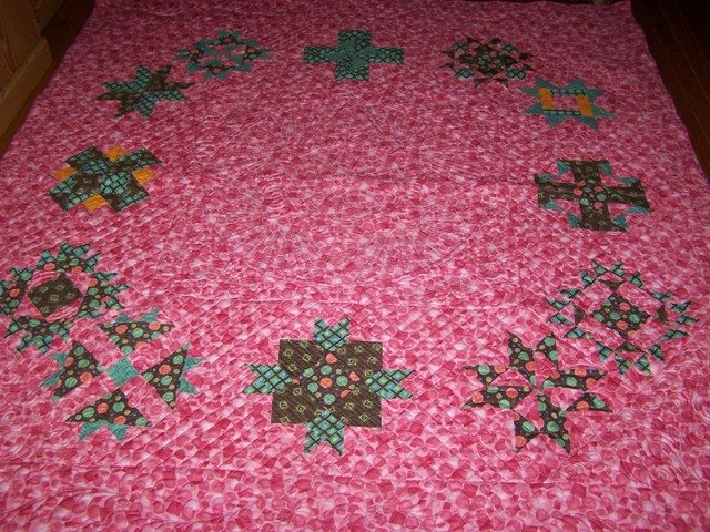 stitchnstroke Pink Patience - Blocks were from Among Friends BOM for 2008 and I used Sample 4 from Renae's Amazing Rays in the center of it. The quilting is best viewed from the back so that's the picture I've uploaded here.