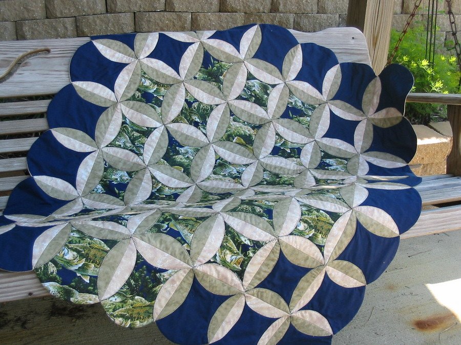 Mamaroo Ye Ole Fishing Hole - My brother is a fisherman BIG time. So I bought this fish fabric with him in mind but wanted something with a round pattern to create fishing hole theme. Had bought the Circle Magic template a long time ago and had messed up my first try with it so it sat collecting dust. I found a pattern in Fons and Porter Magazine giving tips on the Circle Magic Pattern so I got brave and tried again. It came together great but didn't have enough fish fabric for each block so threw in navy. Used fannel instead of batting- looks thin, drapes great but very heavy for those Iowa winters. He LOVES it.