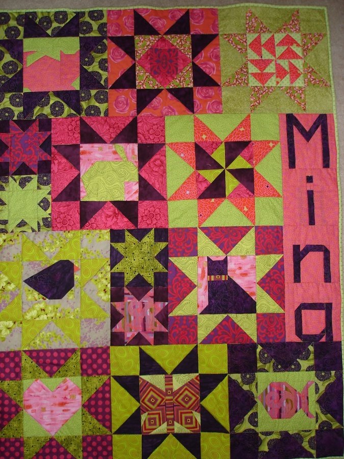 katherinequilts California Baby - I took classes using the techniques in Alex Anderson's Keep Quilting. When our CA daughter had a baby I thought this pattern might work for the materials she picked. The fabrics were really difficult for me to work with and I bought many added fabrics to try to make it work. It's one of the most expensive quilts I've made because I made so many changes! The backing is minky. It's a good thing bright colors are nice for babies ! (I made California Baby II with just some of the leftovers and fabrics I couldn't use)