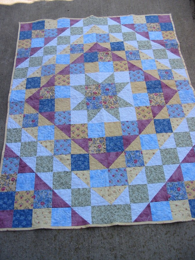 Mamaroo Cottage Garden - This quilt came from Fons & Porter Half Yard Challenge Show in their 700 series. Involves several half yards cut up into strips and then each strip cut to a certain square, half triangle, and quarter triangles. Then you take these pieces to the design wall and create. First time I'd done a medallion type quilt. Was fun to play and hard to settle on one. Would love to try this with several people to see what we'd each come up with.