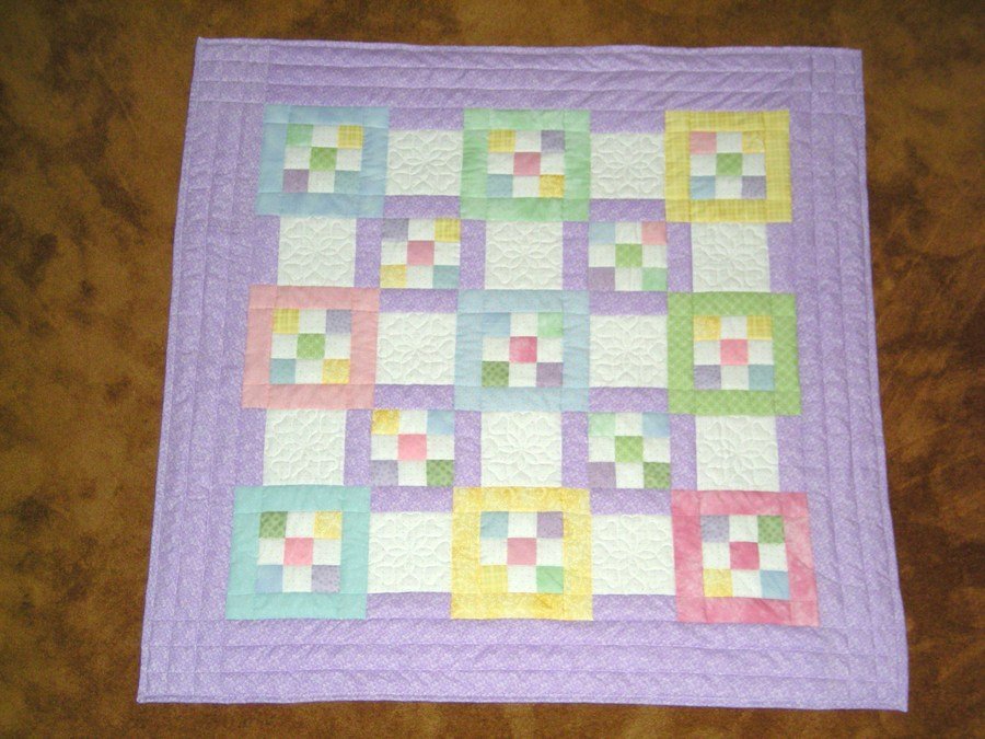 WillieRae Gracie's Quilt - I made this quilt for my new granddaughter Gracie. The 9 patch squares seem to float when bordered with the lavender. I used my embroidery machine to quilt in the white squares.