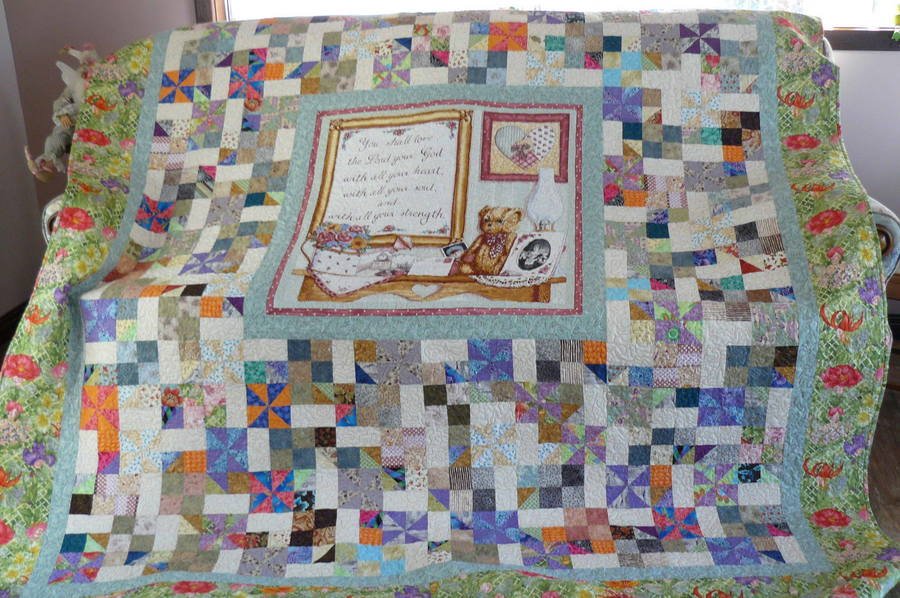 kerry6215 Celebration~ Life Faith and Friendship - This quilt was made for a wonderful friend's 60th birthday.I had the panel and designed the blocks after seeing Alex's demonstration on neutrals and using pinwheels and 1/2 square triangles.
