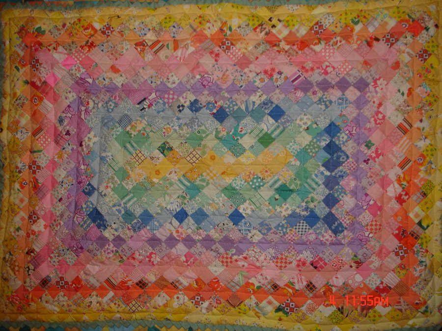 venusgma Baby's Trip - Unfinished top and extra quilt pieces purchased at a farm auction. The vibrant colors have never been washed or faded. The one inch squares are set on point and the fabric dates from the 1920's. I finished it to a baby size and added an edge of prairie points.