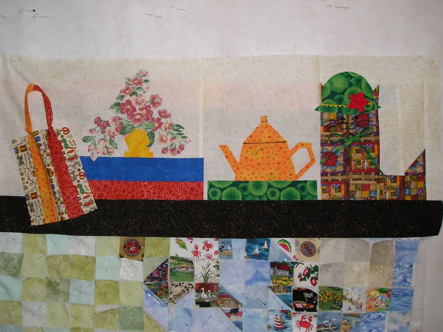 quiltphoenix Sam's strip - Our mini group decided to try a round robin using strips. we each had a theme and provided our own fabric. Sam's theme was Friends, animals, and tea. Since I was doing the last strip, I realized no one had quilting things, so I added a shopping bag and quilted cat.
