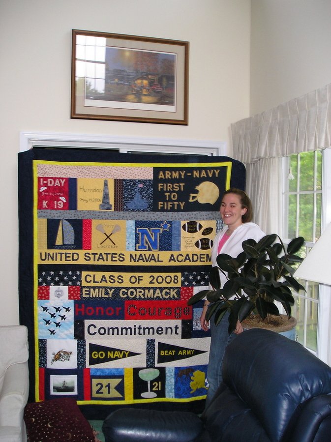 quiltphoenix Emily's Navy - My son graduated in 2008 from the US Naval Academy. Besides his roommates, some of his closest friends were four female Midshipmen. Three we called "the triplets", because they hung out together all the time. Emily was in a different company but always around. Rachel's Mom designed these quilts with specific events documented for each female Mid. She found someone in Ohio to make them for her. They were awesome!