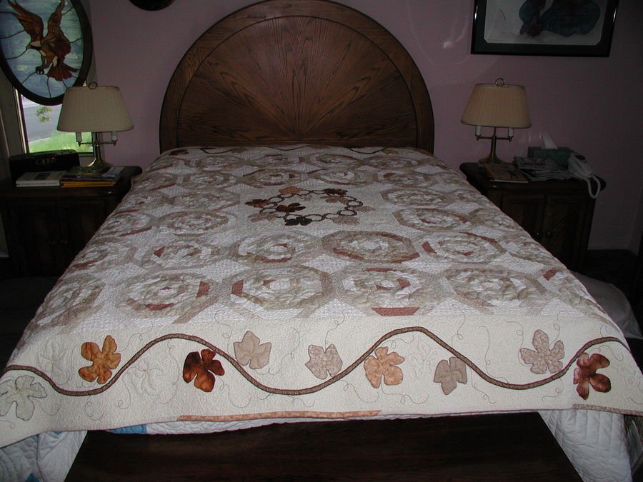 Brenda1 In the Vineyard - I designed this quilt top to be the 2007 raffel quilt for the Columbine Quilt Guild in Arvada, Colorado. I drafted the 12 1/2 inch square blocks as paper foundation and cut strips and made block kits to hand out to members to sew. I did the applique in the center and borders and qulted with trapunto and lots of back fill on my longarm.