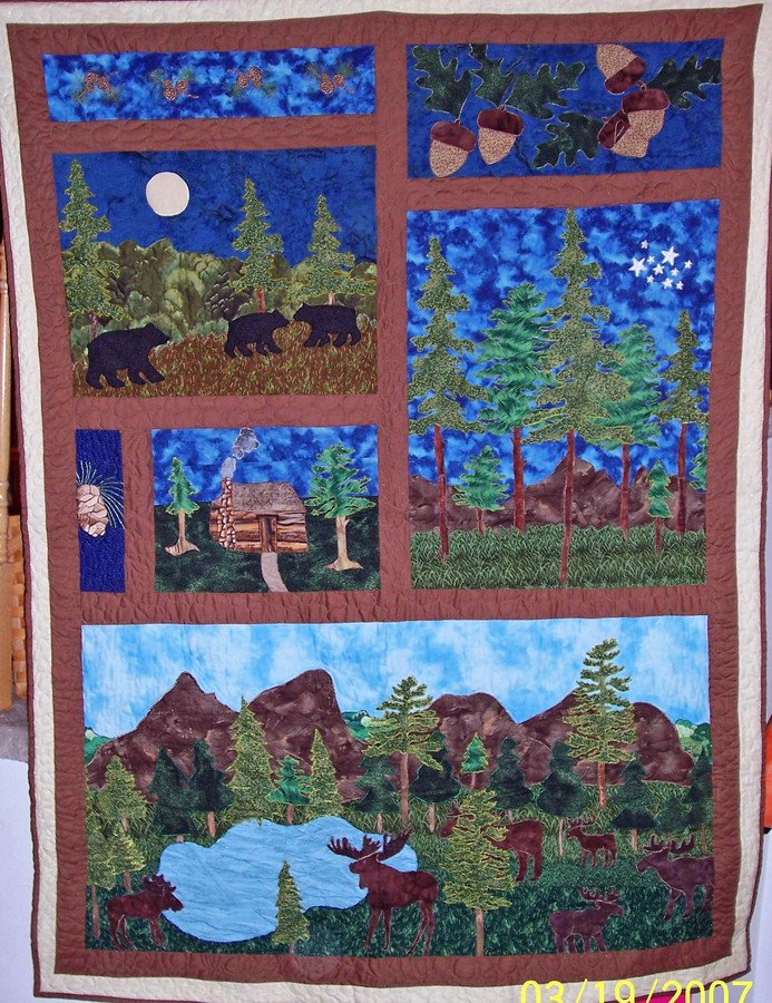 | Design Source - Description | Moose, Bear, and cabin appliques on landscape blocks with saching between. Embroidered pinecones added. |