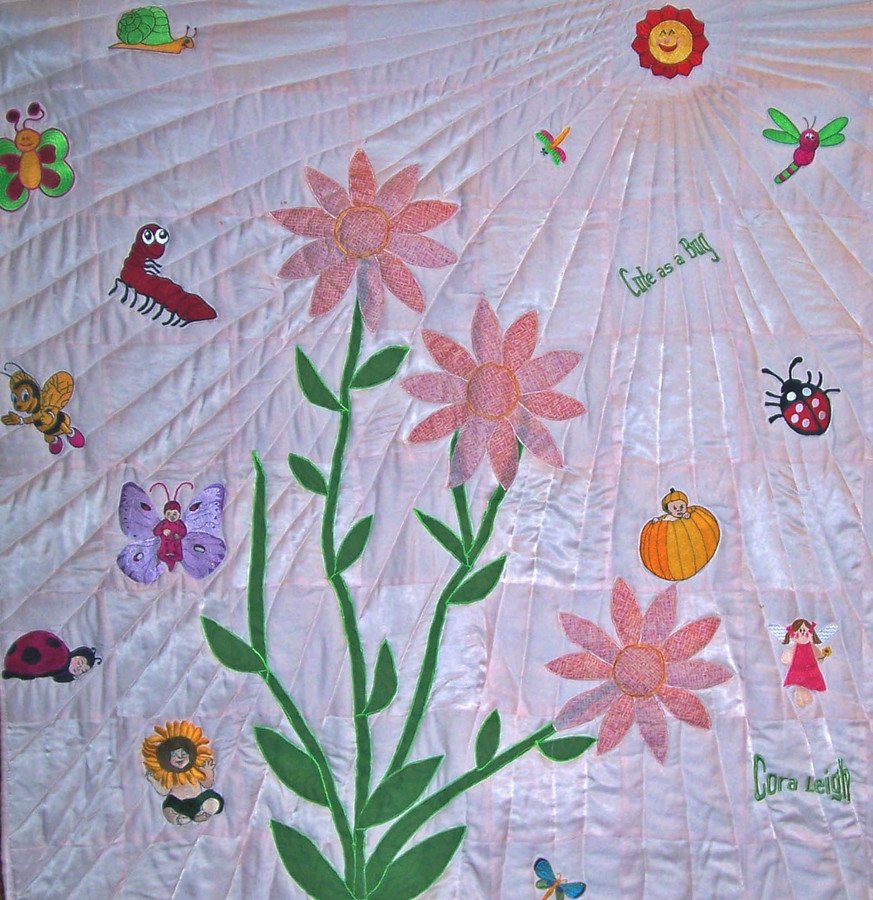 | Design Source - Description | Peach "Cuddlecloth" squares (one side satin, other flannel) alternated with large sunflowers and leaves appliqued. Embellished with machine embroidered bugs and words. |