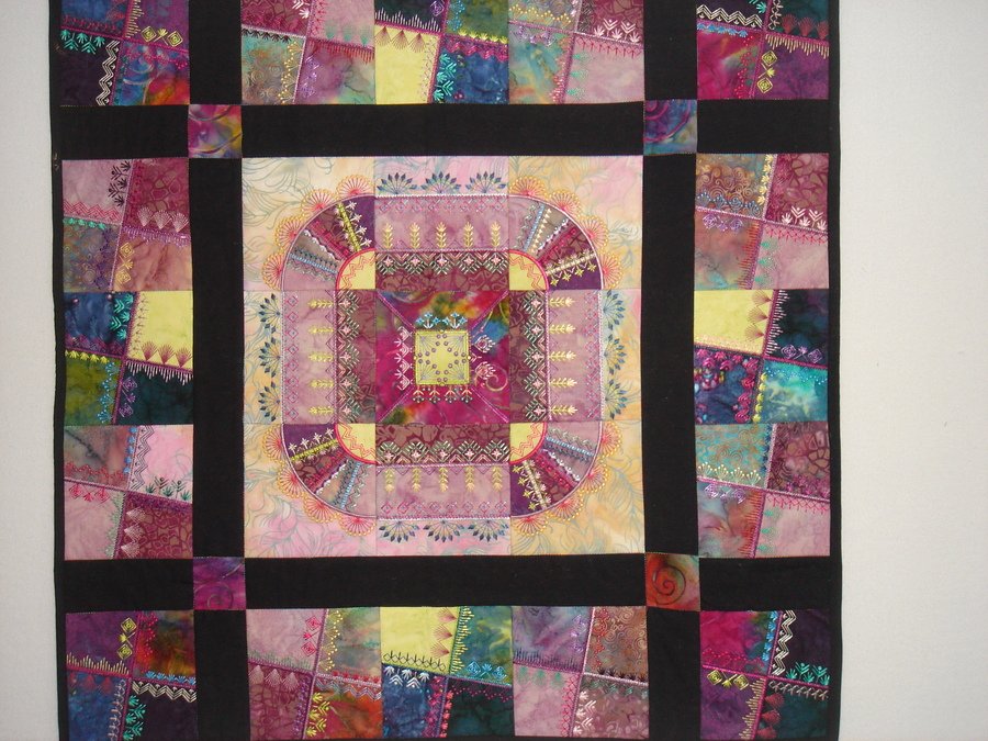 imapiecemaker Fancy Stitchin - 25 block quilt; Applique in the hoop on an embroidery sewing machine; Fabric is 11 different batiks, plus a black sashing; 24 different embroidery threads; embroidery by machine to simulate crazy quilting; quilted in the ditch using King Tut variegated thread.