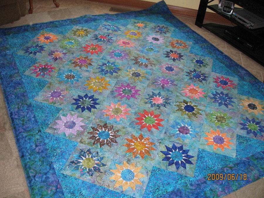 glorybquilter Sunshine and Blue Skies - This quilt was pieced and appliqued using Laundry Basket pattern but doubled to a King size, using a large number of batik fabrics. Made as a gift for my son and his new wife to celebrate their wedding in June 2009, and beautifully quilted by Jennifer Cunningham, Indianapolis, In.
