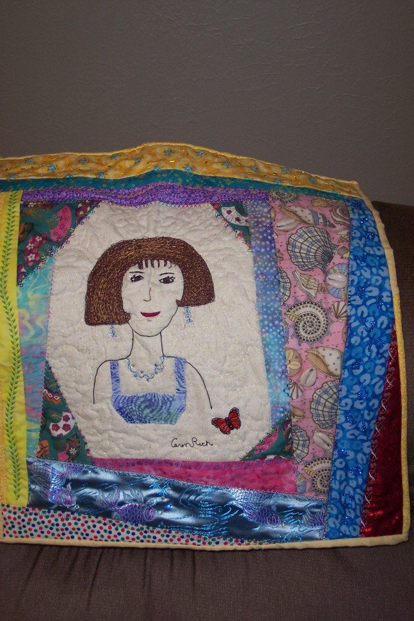| Design Source - Description | I've seen many self-portraits and wanted to try it out. I slao wanted to practice thread painting. So I did both. I crazy quilted the border and added beads, buttons, hot fix crystals, and shells. |