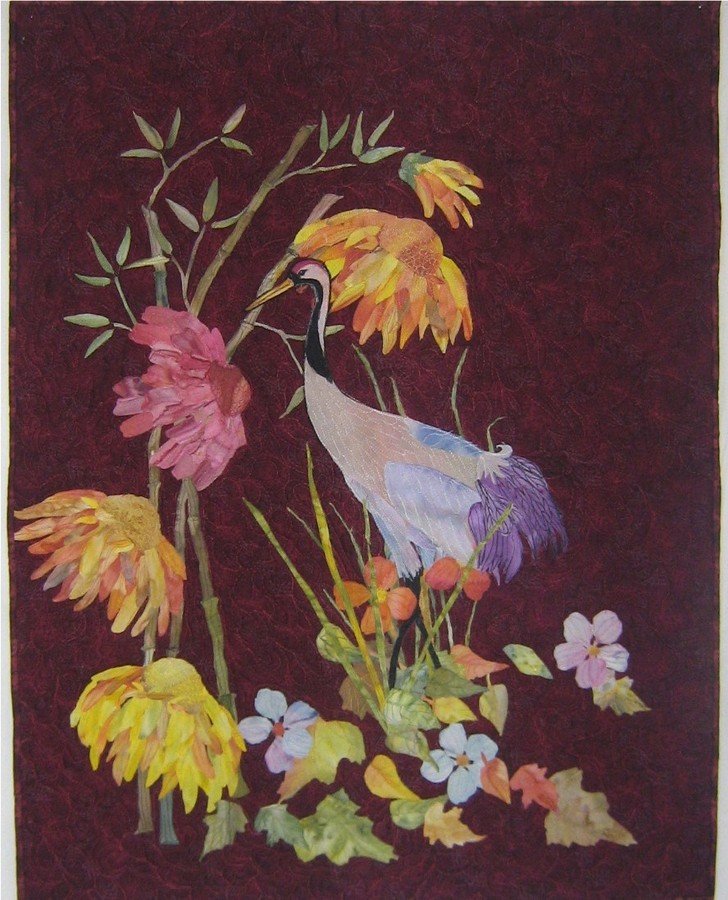 Rhoda Tancho, Keeper of Fidelity - Tancho is the Chinese name for the red crested crane. They mate for life. Is this one searching for a new mate or pondering the passing of her former mate? This piece won 1st place Viewers Choice at our local quilt show in April. Raw edge applique, using my hand dyed fabric. Quilted on my home machine.