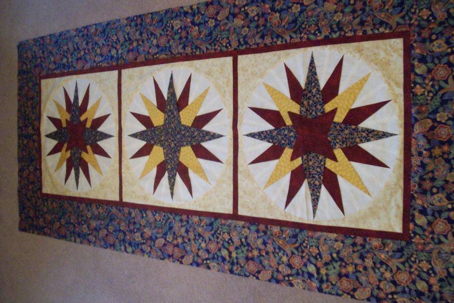 crowefan0517 3-D Mariner's Compass - This quilt was completed using a folding fabric technique. The block was taught at a class at Quilter's Attic. The first two blocks were mostly completed in class during the Spring of 2007. the 3rd block and the rest of quilt was completed about a year later.