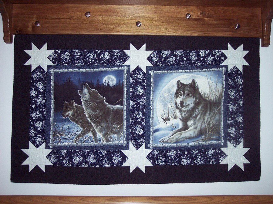CHERIFFIC Twilight Wolves - The wolves were printed on fabric. I just cut them into even squares and sashed them to add some interest I put stars for the corner stones. The border around the wolves is not symetrical so it gives it a slightly crooked look. I made this wall hanging for my husband he loves wolves. I used a silver metalic thread to quilt the stars and the moon.