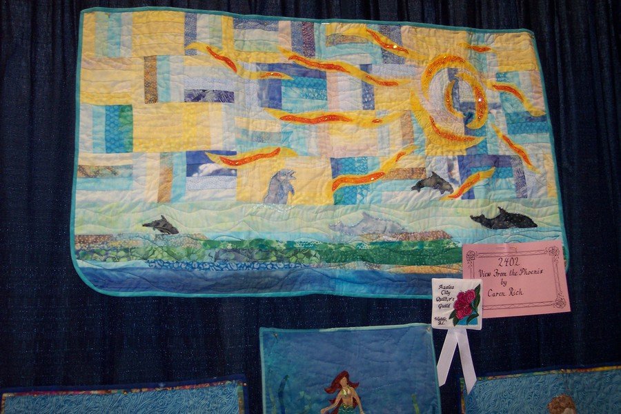 pjmama View from the Pheonix - This was made after a Father's Day weekend at Orange Beach. Dolphins were everywhere. The background is pieced. The sun is raw edge fused. I wanted it fuzzy like the sun on a hot day. The dolphins are needle turn applique. Beads were added for extra sparkle