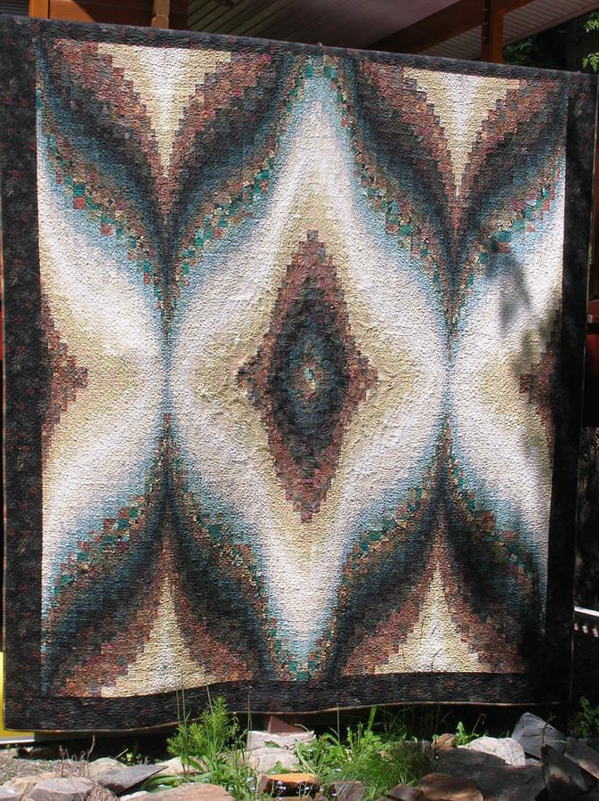 QuiltfireStudios Moyie Tranquility - This was my first quilt. It is a king size bargello and has 28 different fabrics in it. The top was completed in 2004 and I finished the quilting in 2005 on my domestic sewing machine. This quilt is on the bed at our log cabin in Moyie, BC. The colors (terracotta and teal) were chosen to represent the wood of the cabin and the greens of the surrounding forrest.