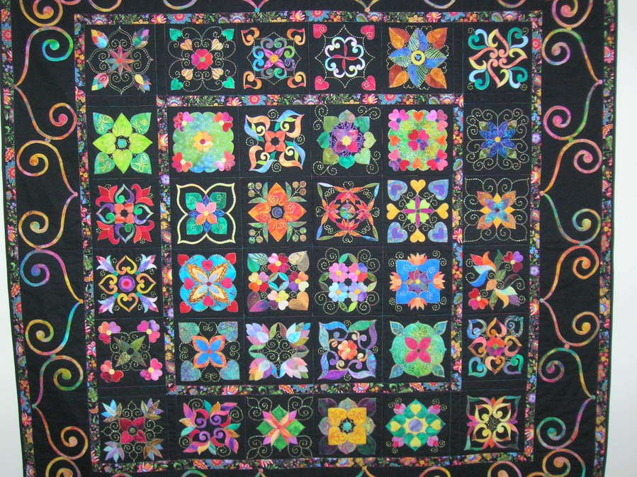 QuiltfireStudios Affairs of the Heart - I first found this book on a website while surfing on the web. To my amazement, the author lived in my home town. So I called her up and went to her house to pick up two copies, one for myself and one for a friend. Around two months or so after I had purchased the book, this was offered as a block of the month at my local quilt shop. Of course, I jumped on board! I didn't do it with needleturn applique like Aie Rossman (the designer) did because I detest hand sewing. I did very little quilting on it because I didn't want to take away from the spectacular design.