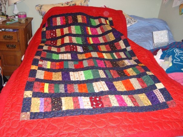janmax Scrappy Stripes - My daughter moved to New York in Sept 2008 and I made her this quilt for Christmas from all the scraps lying around my sewing room. She says she can visualise all the quilts I've ever made from the various pieces of fabric and it reminds her of home. I bought red brushed cotton and brought it round to the front so it is soft and warm against her face.