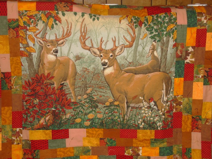 vperry Deer in the Fall - The large deer at center are surrounded by 2.5" strips of the fall colors in the panel. It was blessed and tied by the Prayers and Squares group and the congregation of The Church of the Resurrection, Loudon, TN