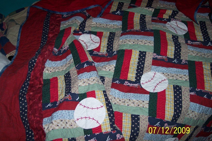 | Design Source - Description | This quilt is made using Joshua's favorite colors and featuring Atlanta Braves Fabric, his favorite baseball team. Was Hand quilted using red quilting tread to compliment the front and blend with the back. |