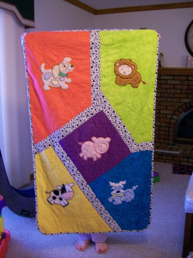 Helen1230 Hadley's - This quilt was created for the birth of our fourth grandchild, the third granddaughter. It is similar to quilts I made for grandchildren number two and number 3. The back of this quilt is white minkie and it's very soft and cuddly. A matching drag-along blanket was made to compliment this creation.