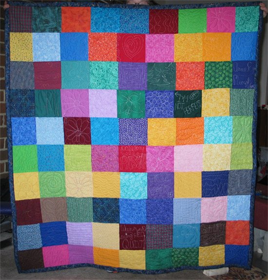AnneEMZang Colorful Quilting Practice - I decided to make a fun rainbow quilt partly to replace the first quilt I had ever made back in 1992 and partly to make a bright colorful quilt that would allow me to practice machine quilting. My rule for myself was to do a different quilting design in each square. Up close, you can tell I was no pro, but I had fun with it, quilting things like, "When you're seeing red, QUILT!" and "I am not perfect" with an arrow pointing to a mistake. I really just wanted to let go and have fun...and I did. I usually keep this in my car in case of emergency picnic.