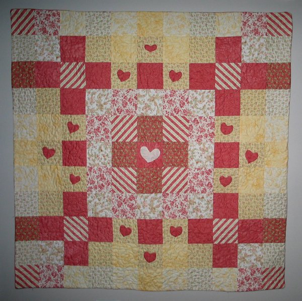 AnneEMZang Hearts Don't Fade - I made this using a stack of 5" Moda Faded Memories fabric I had. I stippled it and bound it and added the hearts by hand applique afterward because it wasn't quite "there" yet. This quilt was made for hospice through a program with Northwest Suburban Quilters Guild in Arlington Heights, IL. When I told the organizer (a wonderful woman with a long lifetime of experience) the quilting was pretty basic stippling, she said it was fitting because like life, it has no distinct beginning or end....it meanders through many hearts...and I really liked that...