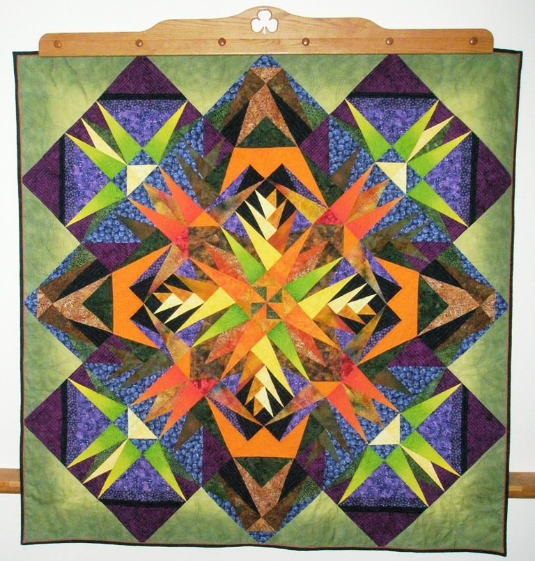 CMOELLERS Grandstand Fireworks - I was intrigued with Margaret Miller's TQS segment in Series 4 on angle play blocks, I had to make one of these amazing quilts. This quilt has over 15 different triangle blocks and over 25 different fabrics. I just love how it turned out. I had so much fun selecting the fabric for this very eye popping quilt. Tim Juhl did the quilting and he did a fantastic job. It will be entered in competition to be judged at the Iowa State Fair. We are both very excited to see how it will do. See the next picture to admire all the fantastic quilting that makes this quilt just burst with excitement. I used Ricky Tims piped binding techinque to finish off the quilt. It was just the perfect touch to complete this quilt.