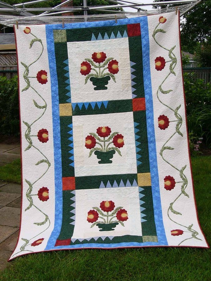| Design Source - Description | The setting of this quilt is an adaptation of a quilt that was seen in a quilting magazine some years ago. The applique block was changed from the original quilt shown in the article. |