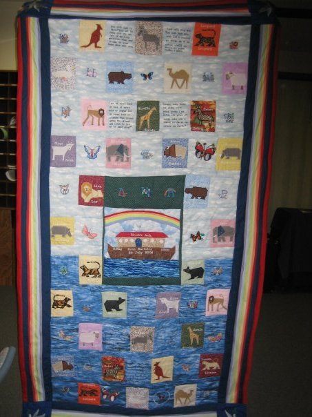 DivineDesigns All About Noah - I used a Paper Foundation Instruction Book for Noah's Ark and all the animals. I did not do paper piecing. Instead, I used the book for patterns and cut all of the pieces fabric, then used fusible web to create the little 4 1/2" blocks. I then used my sewing machine's tight zig-zag stitch to go around all the pieces and give it somewhat of a stained glass look. I placed my animals in every other blocks. Noah's Ark is a large block in the center and it actually pieced together by machine. All of the plain blocks have some sort of machine embroidery. The quilt is a gift for a little boy (distant relative) in Croatia. The animals all have their names embroidered in both English and Croatian. Also, the bible verse where God gives instructions to Noah after he built the ark is also in English and Crostian. It is bordered with the colors of the rainbow and the corners have embroidered doves. I used stitch in the ditch method of quilting.