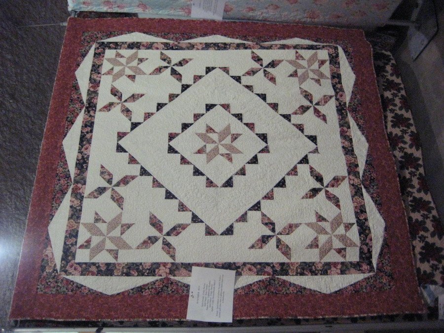 cmd77 Winter Roses - This quilt was made in 2005 and quilted in 2007. We had to pick out our fabrics without knowing what the pattern looked like. I love roses, so all the fabrics have roses in them. The pattern is by Lerlene Nevaril. I do not know if the pattern is published, but Lerlene has written several books including "Over Easy: Creative Ideas for Pieced Quilt Backs (That Patchwork Place)", so the back of the quilt is pieced also.