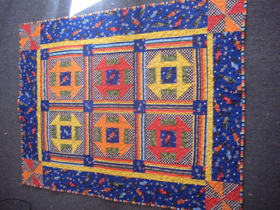 cmd77 Racers for Baby - A friend of mine asked me to make this quilt for a friend's baby. The quilt in the magazine had Teddy Bears in the Churn Dash Block centers. She wanted a car/racing theme. I fussy cut the sashing corners and the center of the churn dash blocks. This was a fun pattern. I found out my friend did not give the quilt to her friend but is saving it for her own grandchild.