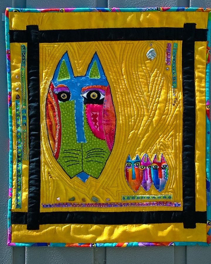 KTDesigns Cool Cats - I had some Laurel Burch fabric that I loved and wanted to use in a small wall hanging. I took one of the designs from the fabric, enlarged it, and appliqued it onto the quilt. Then, I cut out a smaller design from the fabric and appliqued it on as well. Strips from Laurel Burch fabric were appliqued on as accents. I tumble rocks as a hobby and so I added some the rocks I had gathered from Moonstone Beach in Cambria, CA (glued on). There are also Swarvorski crystals as embellishments and some gold and silver threads and even some couched Razzle Dazzle thread. This was a quilt that I simply played with and had fun making.