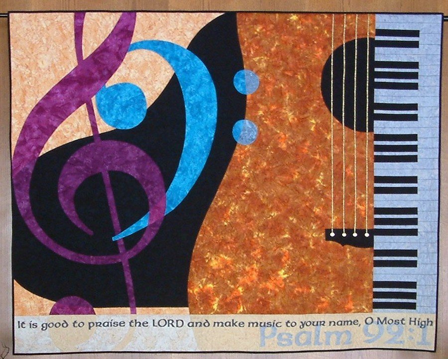 quiltmusic Making Music - This quilt was designed for the music room at our church. My husband and I are both quilters and musicians, and we wanted to add a touch of color to a very neutral room. This is our first original design, and it was created on the computer. All fabrics are Hoffman Batiks.