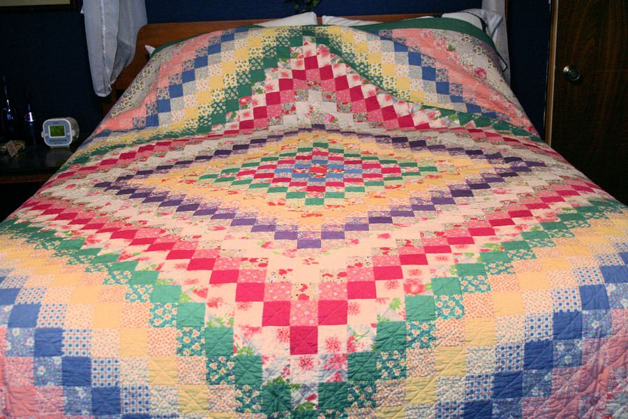 djah55 Rainbow Garden - Squares are set straight and arranged by color to form diamonds. Hand quilted in a grid.