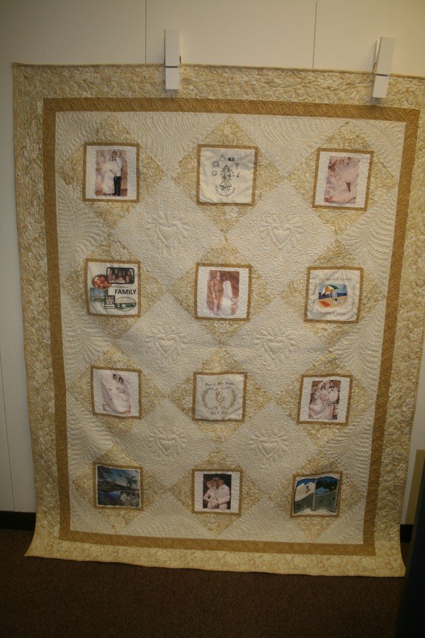 | Design Source - Description | Features wedding pictures of all 5 siblings in addition to my parents. In addition, each family created a block that expressed their family, and I embroidered a block commemorating the occasion. |