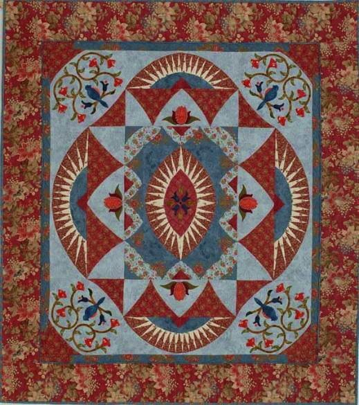 WillowHillQuilts Balenkay - Balenkay is made with elongated New York Beauty blocks and dimensional curved flying geese blocks, also incorporating applique. The dimensional curved flying geese blocks are created in part by making dimensional flying geese and using my manipulated bias method. Moda's Porto Bello Market line of fabrics were used. Balenkay was featured in McCall's magazine as part of a bio piece.