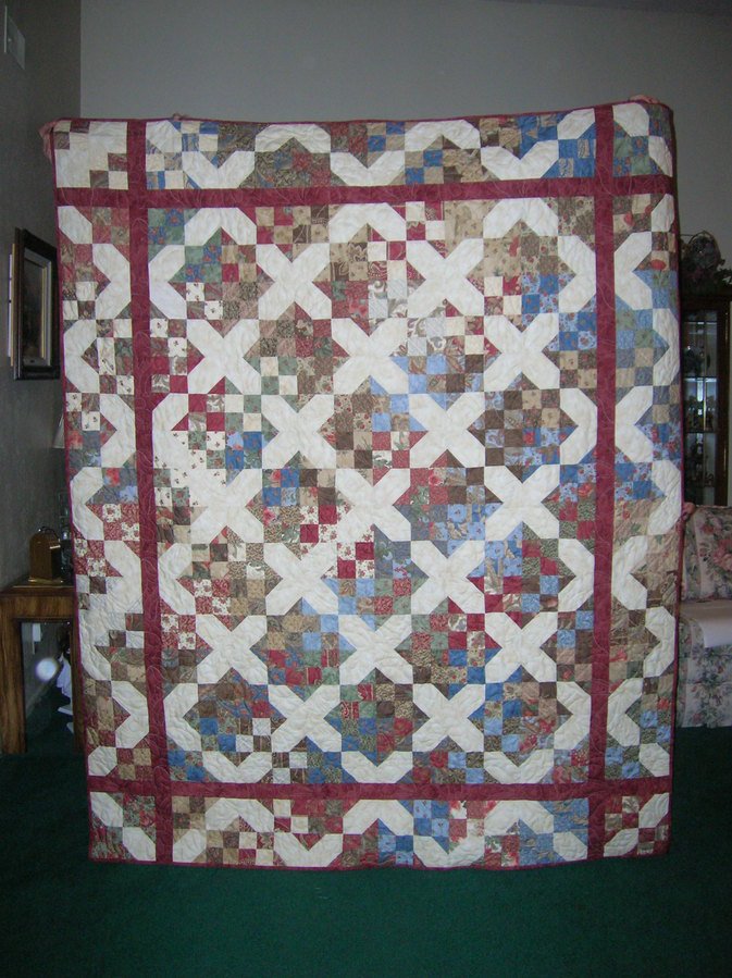 quiltnmom "When Someone Touches Our Lives for Good" - Design taken from book, "Open a Can of Worms", by Debbie Caffrey. The squares werecreated from Moda "Portobello Market" charm packs. This quilt was pieced and quilted in 2 weeks as a gift for a very special friend.
