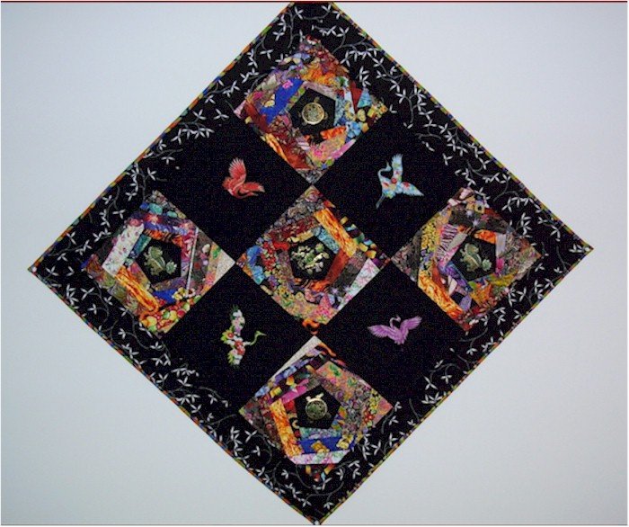 | Design Source - Description | One of my first attempts at working with the crazy quilt block and broderie perse cranes. I was so proud of the final product that I hung it in my bedroom where I can see it everyday. Very striking. |